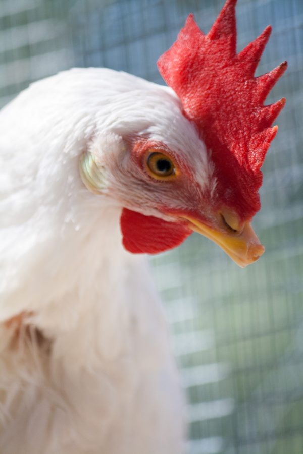 This is Speedbump. His beak and comb have been cut. We don’t know what his story is. Sometimes beaks are cut because the bird is aggressive to others but he’s been a sweetheart to us.