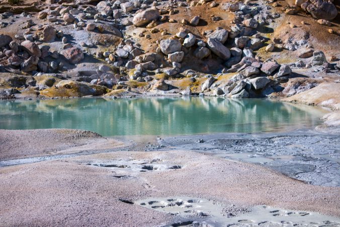 At the bottom are bubbling mud pots, roaring stem vents, and springs that look like cement.