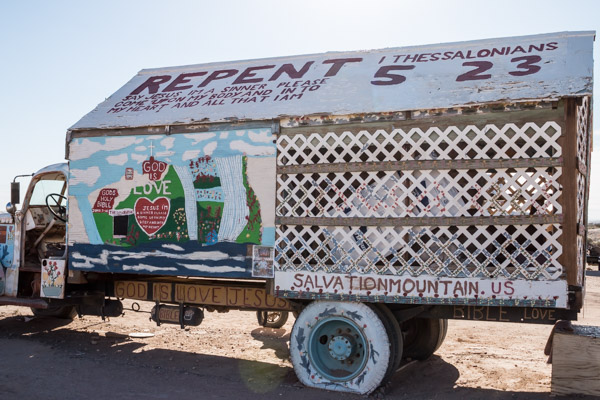 Many people have posted the story of Leonard Knight’s vision and his work on Salvation Mountain. If you want information it’s easy to find so I will just share my impressions with you.