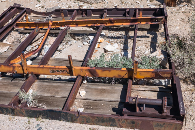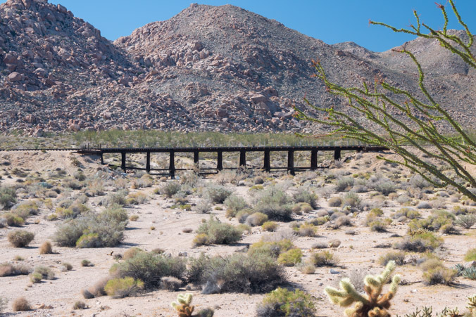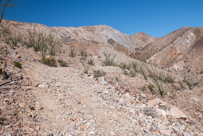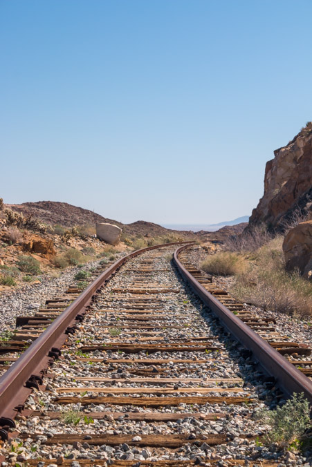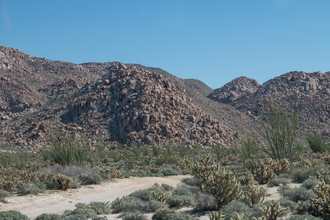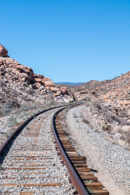 About halfway down S2 is a dirt road called Mortero Canyon Road. It leads in the general direction of Goat Canyon, our destination. Turning onto it we’re bouncing along into the desert next to a small strip mine. As we follow the road toward the mountains it ends abruptly at a parking area for a trail, right at the old train track.