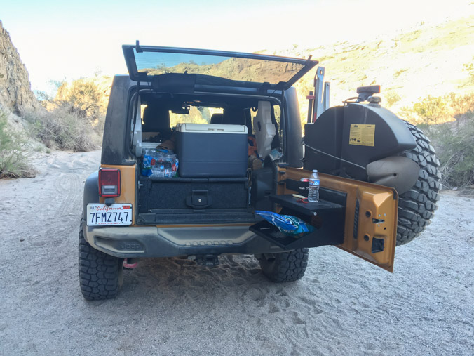Time for lunch in the shade. One of the best things that Jeff added to our Jeep upgrades is this tailgate table from Rockslide Engineering. It folds flat against the tailgate, but easily pulls out for sandwich making. Between the table and our Coleman 40 Quart Plug-in Cooler and we’re ready for good eating any time, any place, even in a slot canyon in the middle of the desert!